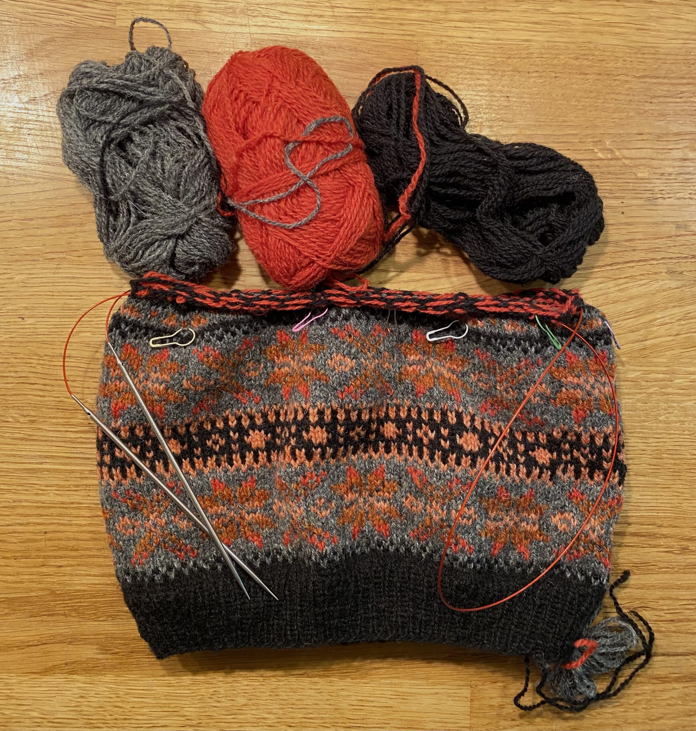 ChiaoGoo rundpinne 55 cm nr. 2,25 og 2,75 og eventuelt 75 cm løs vaier for å strikke Magic-Loop når fellingen i toppen av luen gjøres.